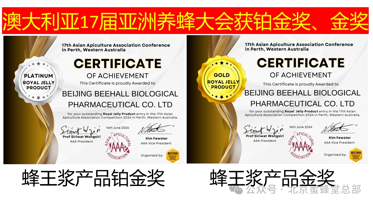 2024年初北京蜜蜂堂在澳大利亞蜂業(yè)大會(huì)上,蜂王漿、蜂膠產(chǎn)品摘得全球首個(gè)最高獎(jiǎng)項(xiàng)雙鉑金獎(jiǎng)。